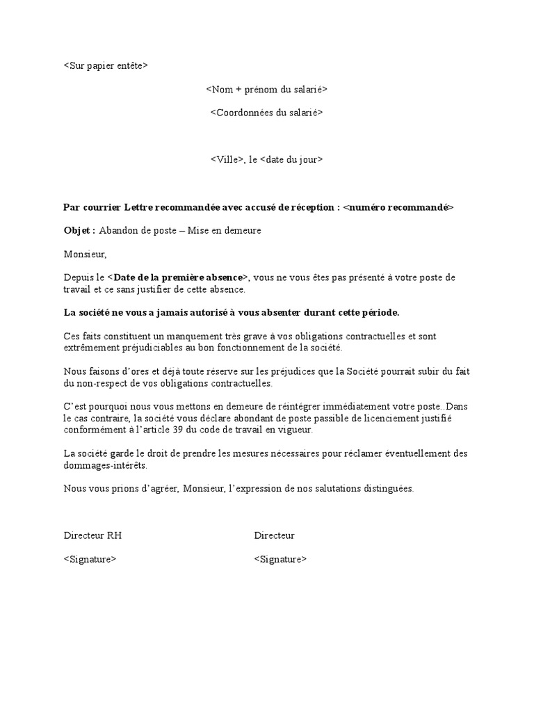 Modele De Lettre De Mise En Demeure Pour Abandon De Poste